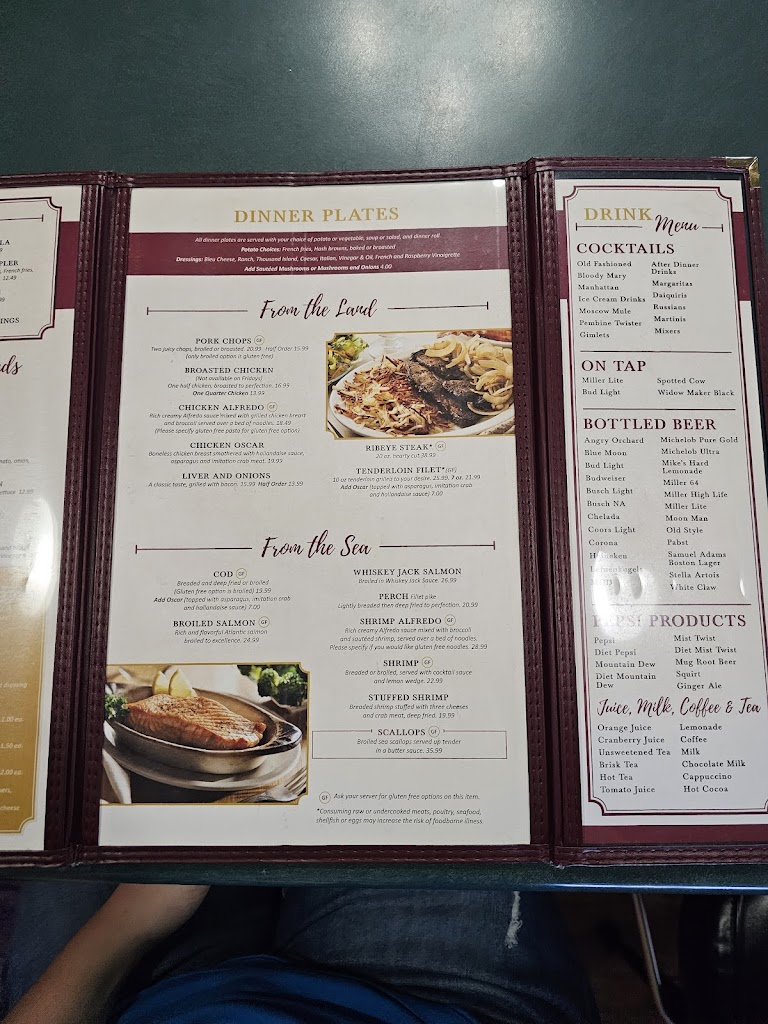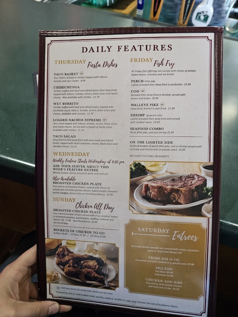 Everything we ate was fresh out of the freezer. Sat in our stomach for hours. The menu said the Saturday special was.... Iβll leave that blank because they didnβt have it. I had a mushroom Swiss burger and they asked what Iβd like for my side, little did I know that anything I chose was a full price item. Ridiculous prices for no product. I should have known by the lack of patrons.