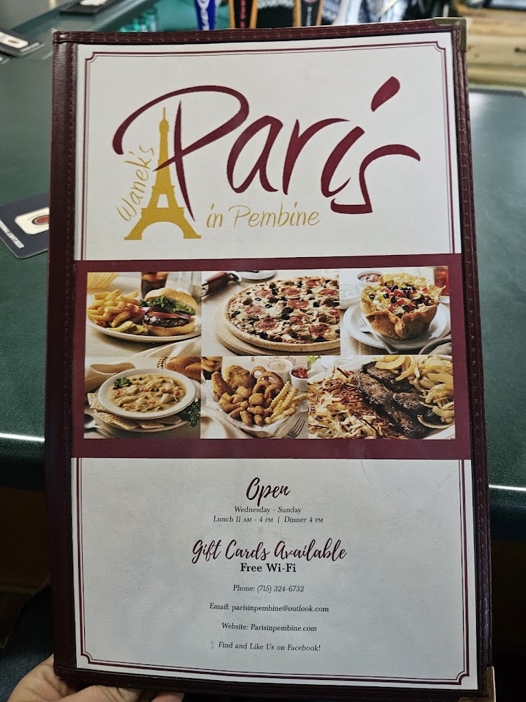 It is no longer called Paris in Pembine. They changed the name and the menu about a week ago. They serve bar food and fish fry. Had the steak sandwich. It was ok nothing special. People there were nice.