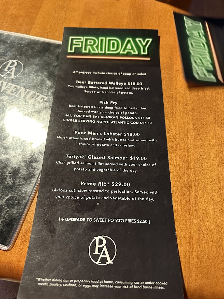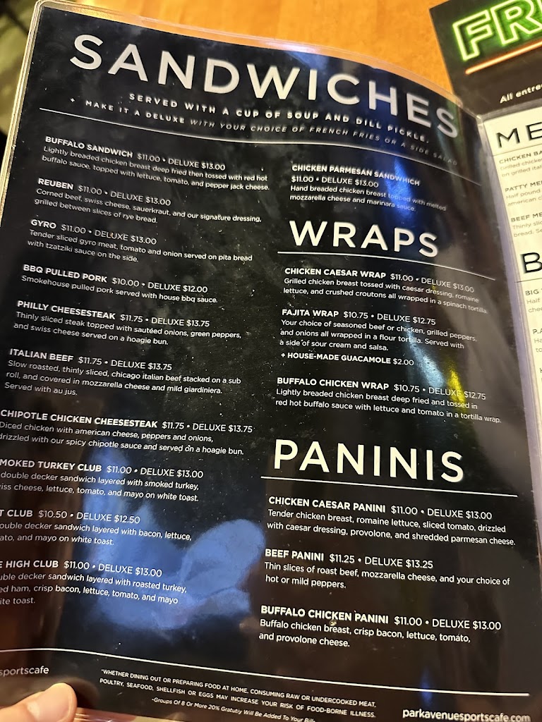 Service was great. Park Avenue has a very nice atmosphere both in the dining area & bar area. I had a Ceasar Chicken Panini. The chicken was so tough. I had a very hard time cutting it, let alone chew it. I was so disappointed. I've had this before & it was great. Don't know what happened.