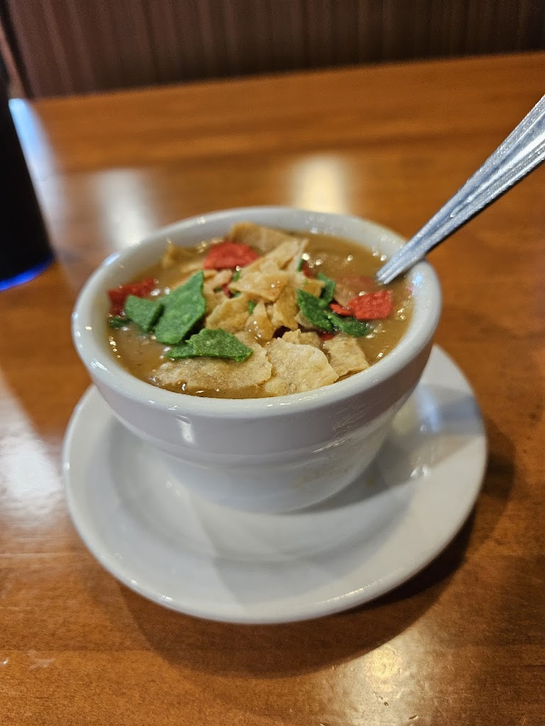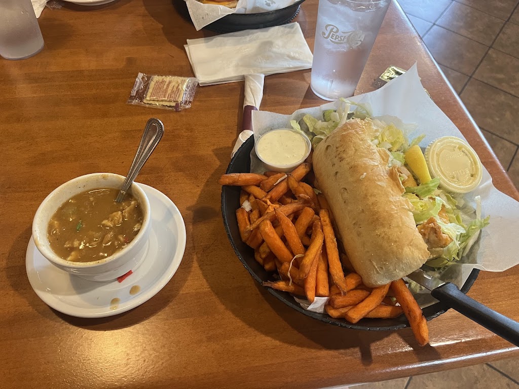I had the fish sandwich, sweet potato fries and a cup of chicken tortilla soup. The fish sandwich had a good portion of fried fish in a large, fresh bun . Sweet potato fries were good but could have more done to be crispy. Soup was fresh and had nice chunky chicken and veggies. Waitress was very attentive and helpful.