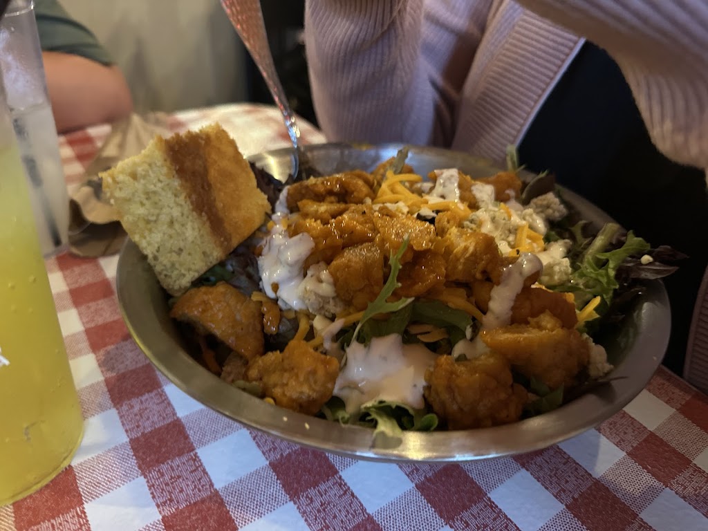 We ordered the fish and shrimp. Our sides were a salad which was nothing but lettuce, mac and cheese which was creamy but had no flavor, potato salad that tasted like straight vinegar. The corn bread was so dry and tasted like it was a month old or more and was like eating flavored sand. As far as the fish and shrimp, well even more disgusting. The fish had so much batter that was all you tasted was grease, I could of greased all the engine parts in at least 2 pickup trucks. The shrimp was okay but again too much batter. Waitress and hostess was the only thing that was of descent service.