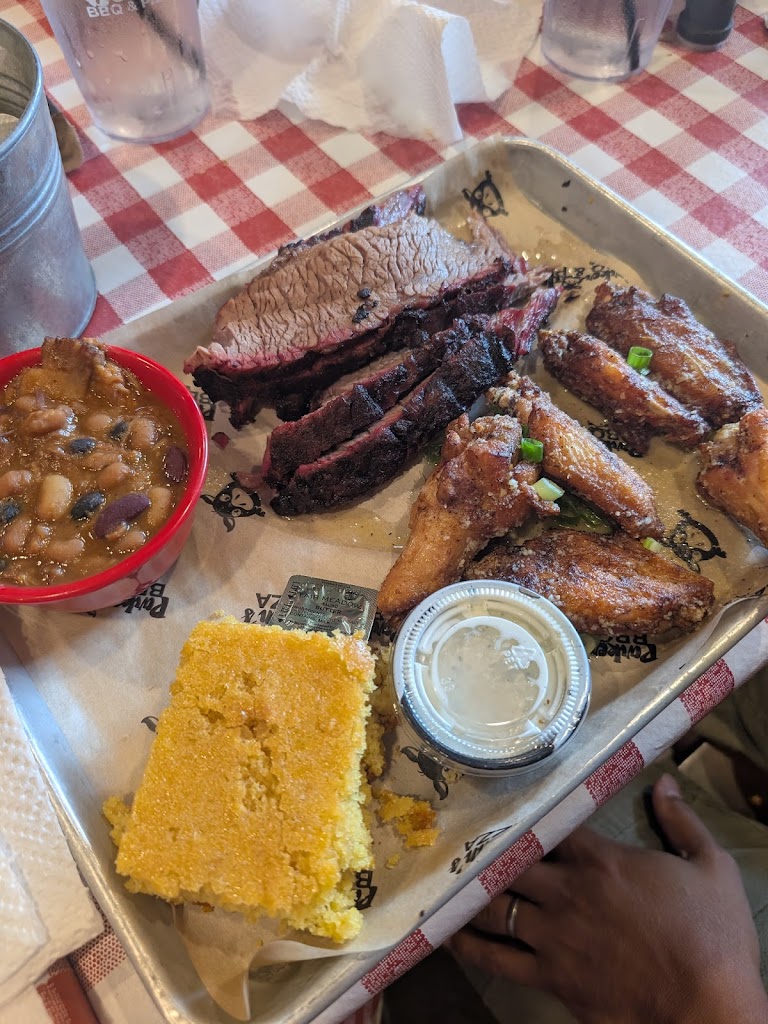 Stopped in for dinner on a Wednesday. It was busy with a lot of younger people (teenagers) and regulars. I ordered the brisket burnt ends. They were decent, nice and meaty, but it had a lot of sauce on it. It would've been nice to chose the BBQ sauce I wanted. I also got a peach cobbler to go, so I didn't get the ice cream. It wasn't the best peach cobbler, it was mostly a cake type crust with a little bit of peaches in the middle. Over all I would go here again and try the all you can eat wings!
