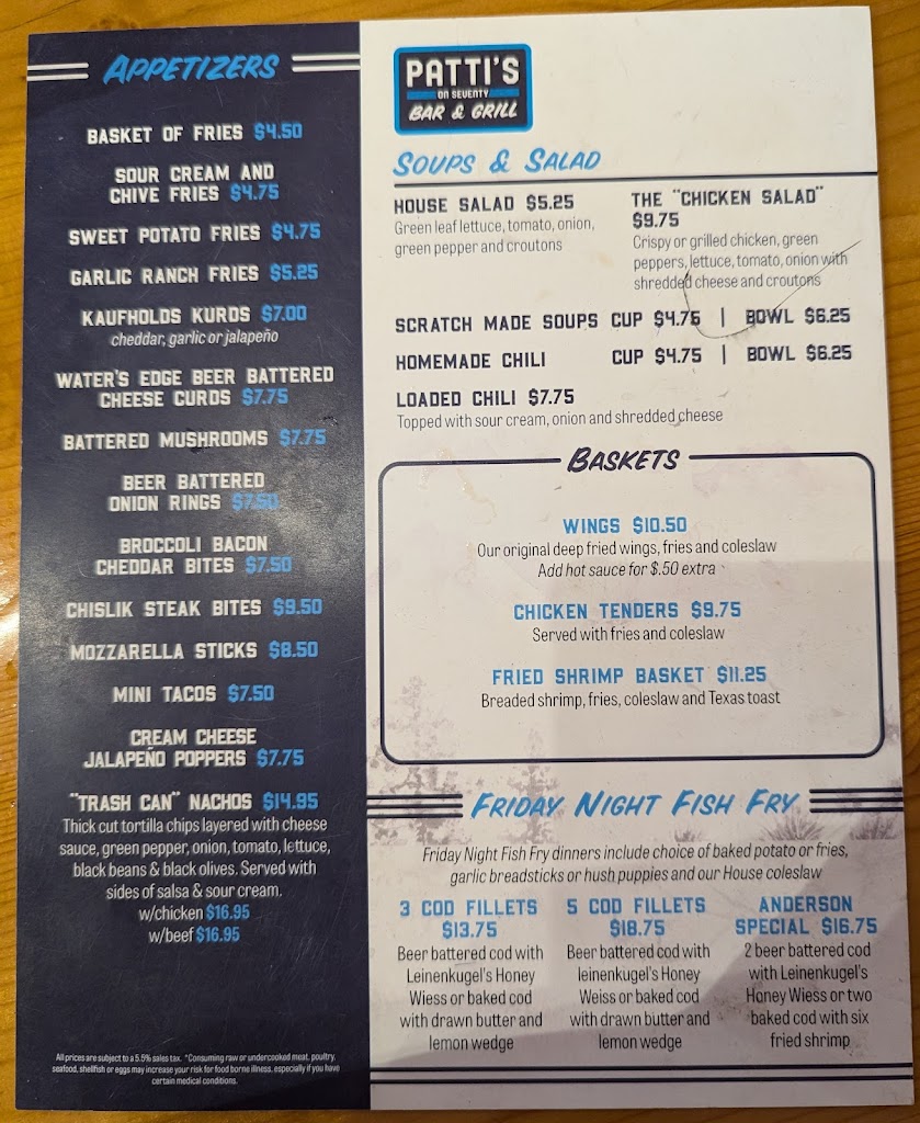 From the food to the service to the great value for the price, you can't drive by without stopping in!! We like to try different places on Friday nights for our Wisconsin favorite, Friday Night Fish Fry!! So on this Friday, we were headed out and about looking for a new "Every Friday Night" fish fry!! We had a most excellent bar and grill that we have been going to for the past 10 years, on this day, they were full of vacationers and wouldn't have a table available for 2 to 3 hours with all the people that were there. Since we were hungry, we started trying new places. Tonight was Patti's On 70's turn! When we got there, we were able to get a table right away, drinks and menus were in hand within 2-3 minutes, and we were able to order within 8-10 minutes after we arrived!!