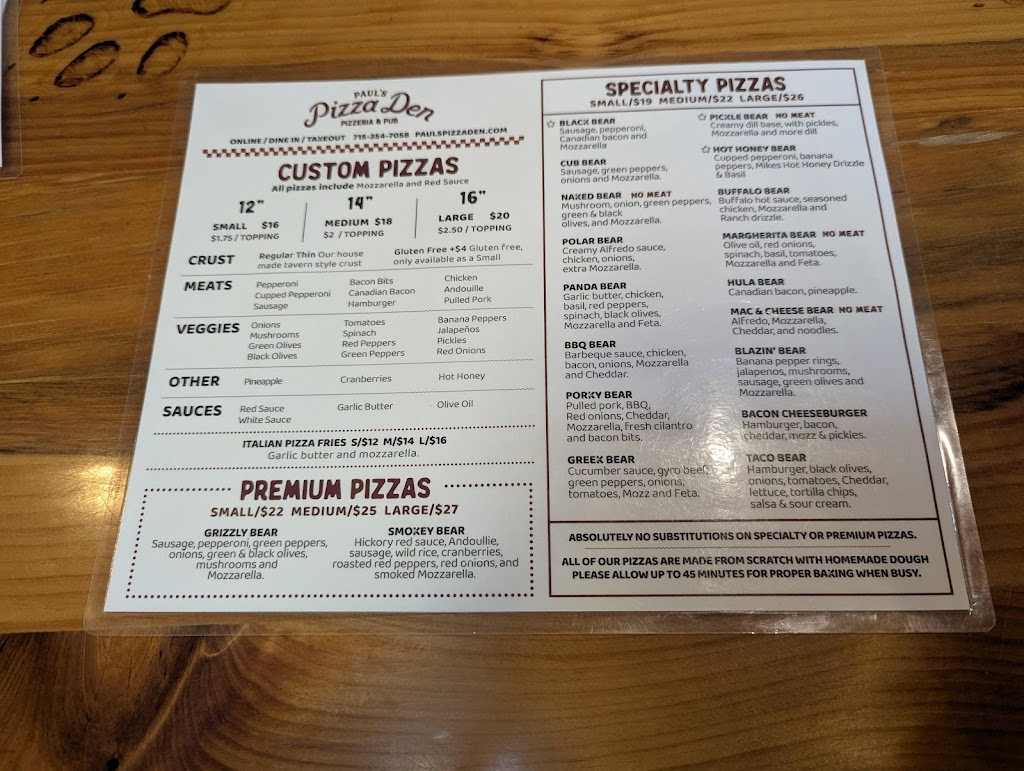 Welcome to Paul's Pizza Den! 🍕🎤 Located in Birchwood, Wisconsin, we’re dishing out delicious tavern-style thin crust pizza, juicy burgers, Italian beefs, pastas, craft cocktails, and ice-cold beers! 🍔🍝🍹 With a cozy Northwoods vibe, it’s the perfect place to kick back and enjoy!