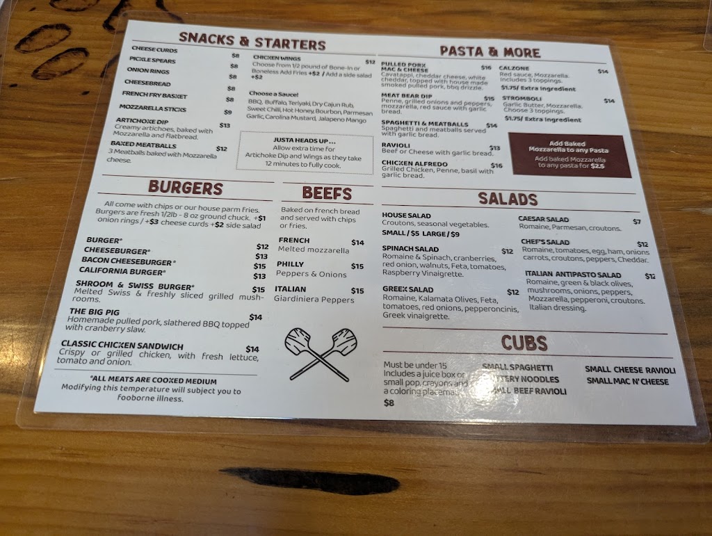My son said the cheeseburger was the best he ever had. My daughter said the same about the cubs spaghetti. I very much enjoyed the wing sauces and garlic bread. My wife accidentally ordered the wrong this and although excited to try the bear meat penne she did get, wasnt impressed.