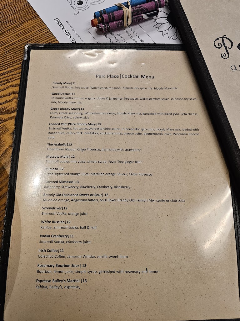 From start to finish, an excellent experience and atmosphere. We were welcomed in and seated at a perfect table. Our server was wonderful. So many delicious items on the menu. We all enjoyed our meals. Side note, fruit cups are generally nasty. Perc Place had a fruit cup that was fresh and a great variety of fruit (not just melon and a green mushy grape)!