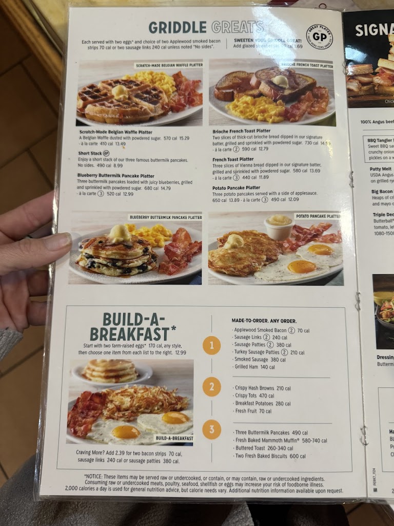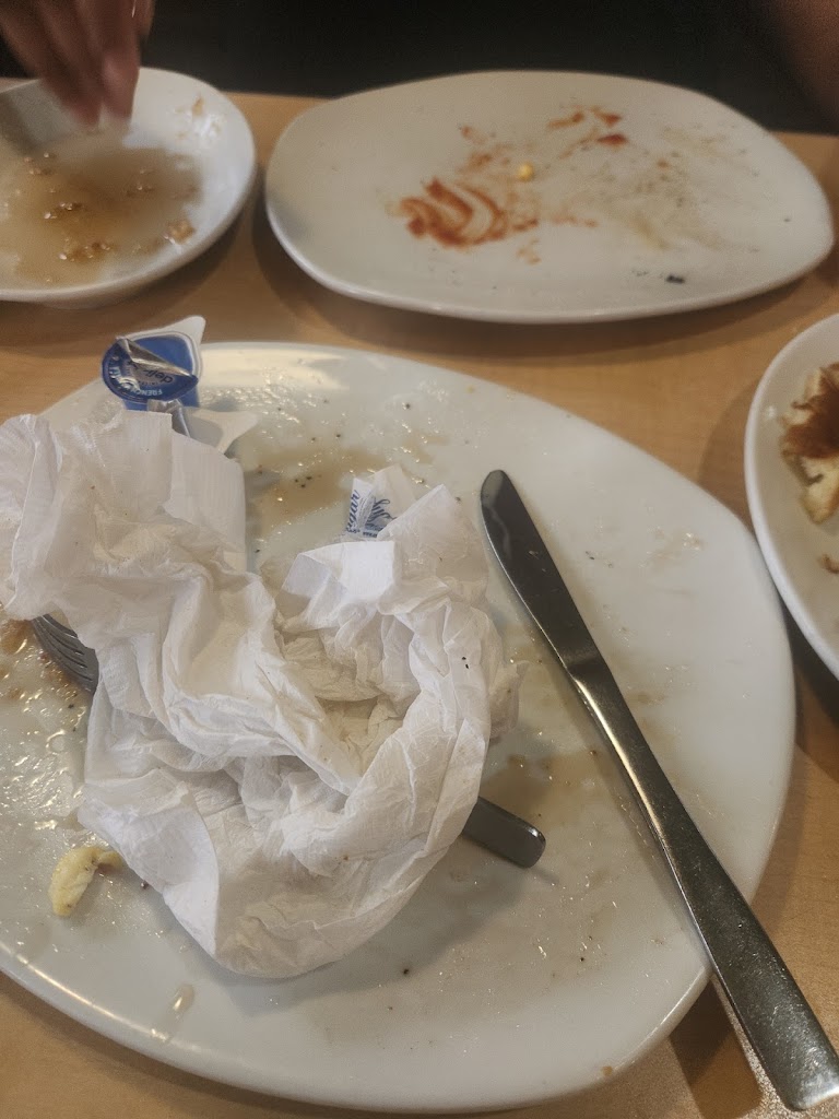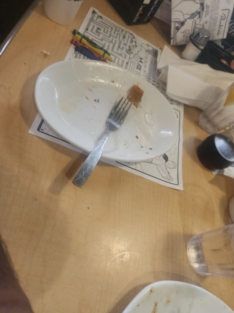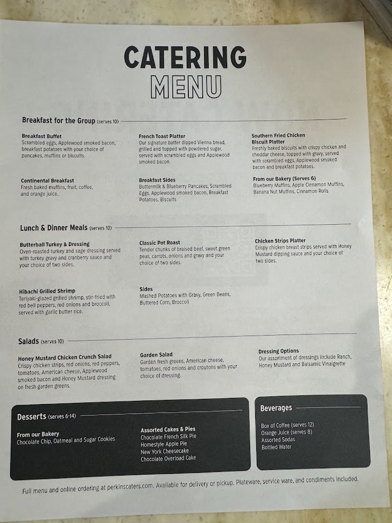 Server brought part of the order out, then the rest of the party had to wait another 15-20 minutes for their food. The rest of the party’s food was barely warm when it finally came out; the other person was finished with their meal by the time it did. Server did not bring out full drink order. Had to remind the server 3 times about the missing beverages. Their menu used to boast many different Mammoth Muffin flavors…this place only had two types available. The men’s bathroom was closed for the entire duration of our visit. Most Perkins I go to provide a kids placemat and crayons for the children…nothing of the sort here. The parking lot for this place is long overdue for some attention.