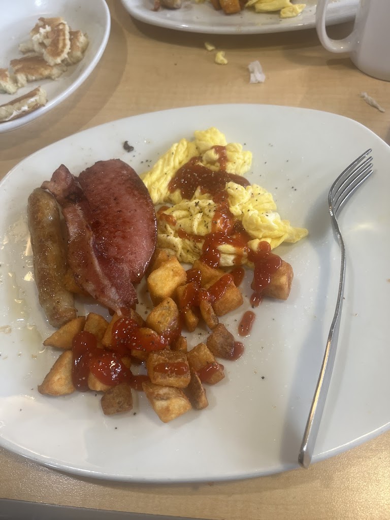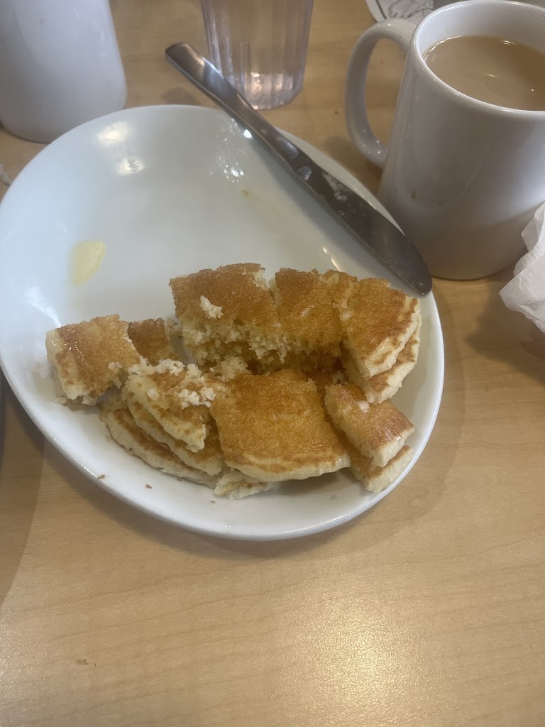 My server was a young man who was full of energy, good natured with a very busy section. The time was 11:30 am. My good was excellent. Pancakes loaded with blueberries, eggs and bacon. Free pie today! Awesome!
