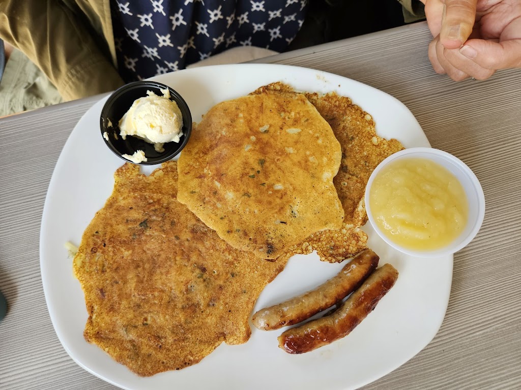Eggs were like cafeteria food. Potato pancakes had a nice savory flavor but we're mostly made of flour, which was a disappointing surprise. Serving staff was excellent.