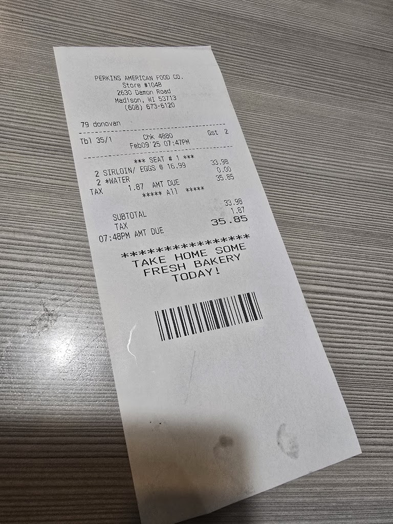 Duane was wonderful. He always makes me laugh or at least puts a smile on my face. The food is really good. If you have a problem they fix it right away. I really enjoy going there. My client and her daughter get so happy when I bring the bag in that says Perkins. They know they get muffins for breakfast. Their muffins are always soft and taste so fresh. You can't beat the buy 3 get 3 free