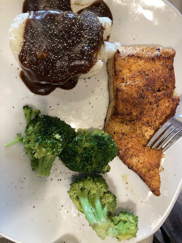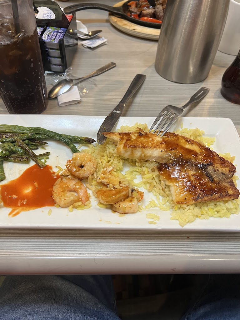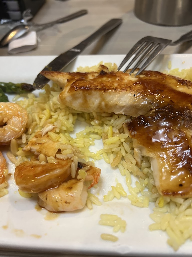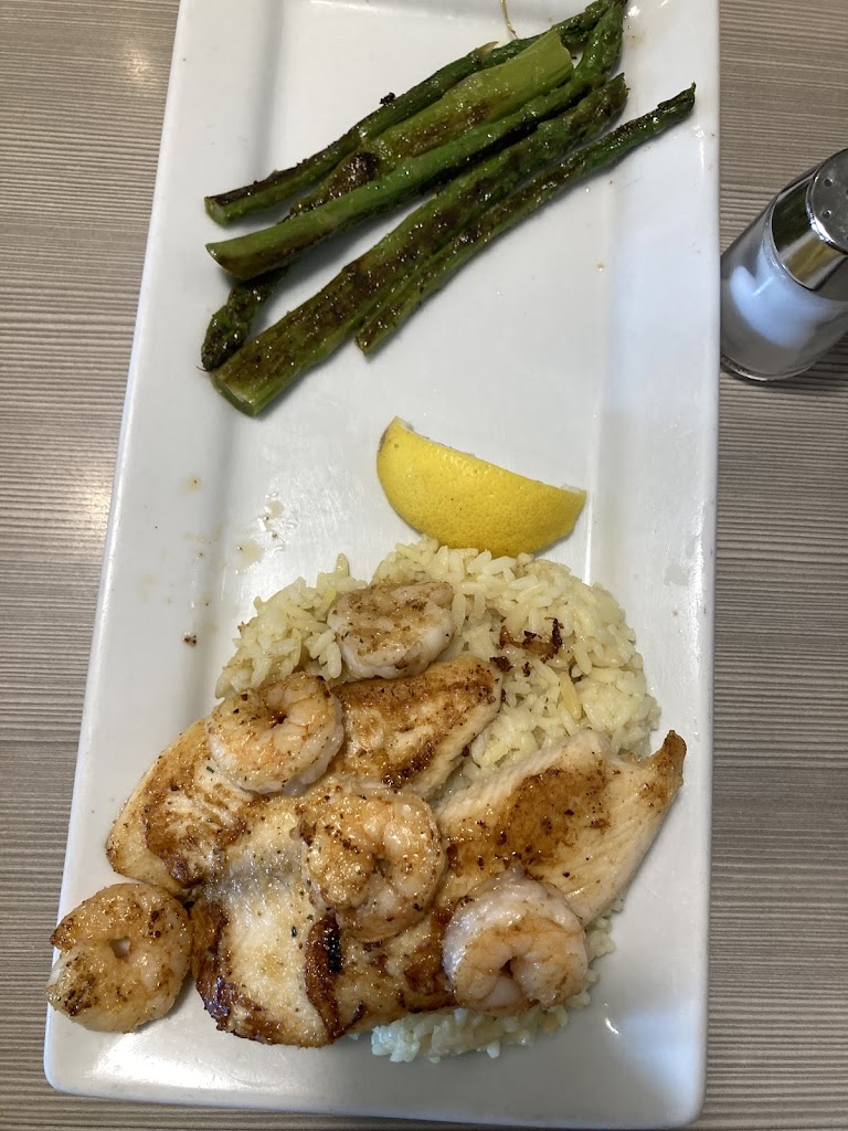 Portions can be seen in photos. Ordered rice, shrimp and baked fish. Salmon, mashed potato, macaroni and cheese and brocolli.