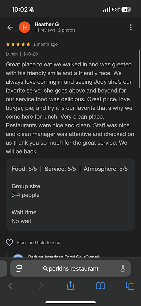 Great place to eat we walked in and was greeted with his friendly smile and a friendly face. We always love coming in and seeing Jody she’s our favorite server she goes above and beyond for our service food was delicious. Great price, love burger, pie, and fry it is our favorite that’s why we come here for lunch. Very clean place. Restaurants were nice and clean. Staff was nice and clean manager was attentive and checked on us thank you so much for the great service. We will be back.