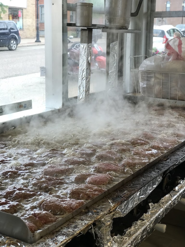 I wouldn’t call it a boiled burger more of a hybrid between flat top grilled like in the old diners made and White Castle/Alpine Burgers but much larger (1/4-1/3 lbs before cooking is my guess) but without the holes.