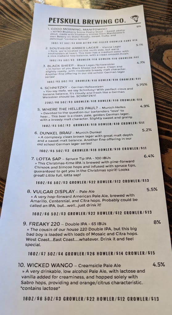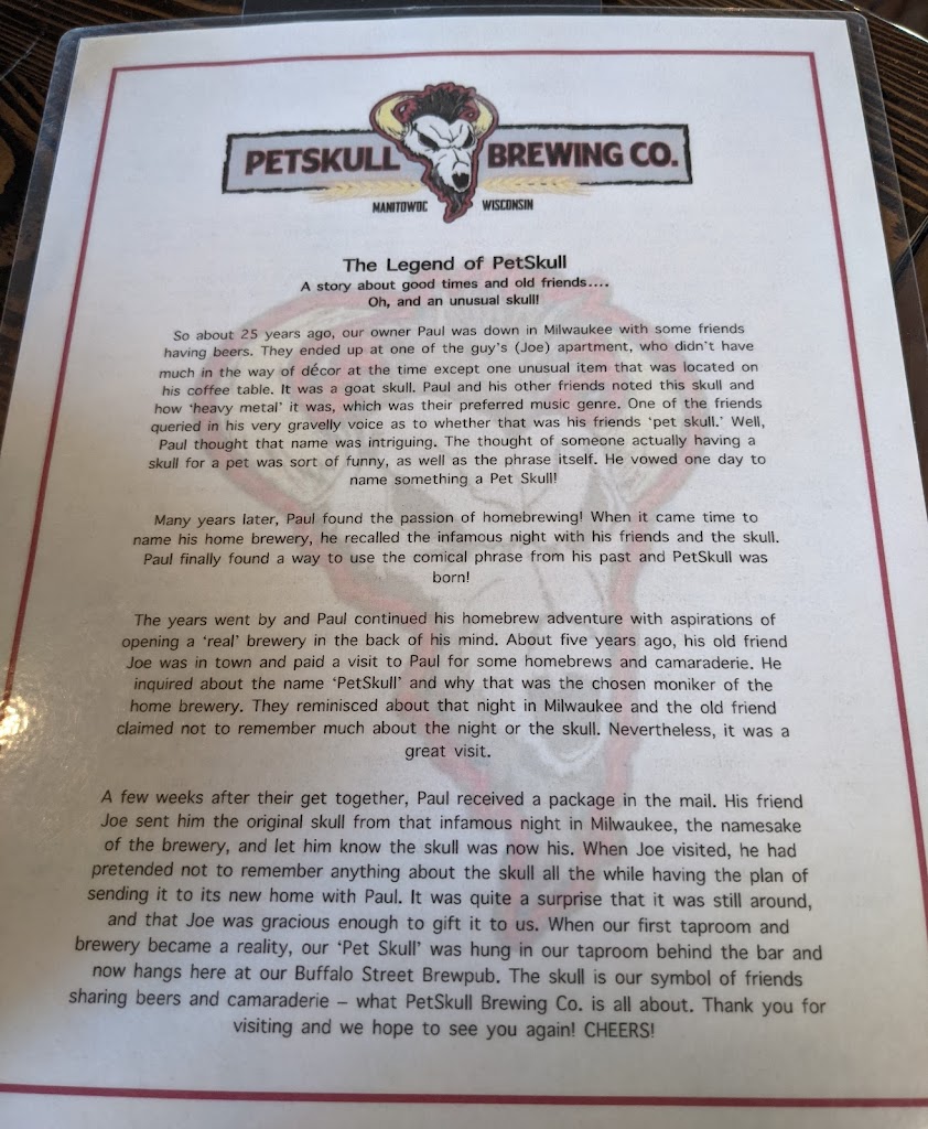 We had a private tour this morning. Paul Hoffman, the owner, said he was testing it out on us. By all means go for it! It was an amazing tour! I appreciated Paul's enthusiasm, humor and knowledge and I learned a lot! And the beer? My sample at the end was amazing. Petskull is a fantastic addition to the downtown Manitowoc location as well as the community. I highly recommend you stop in. I look forward to more to come.