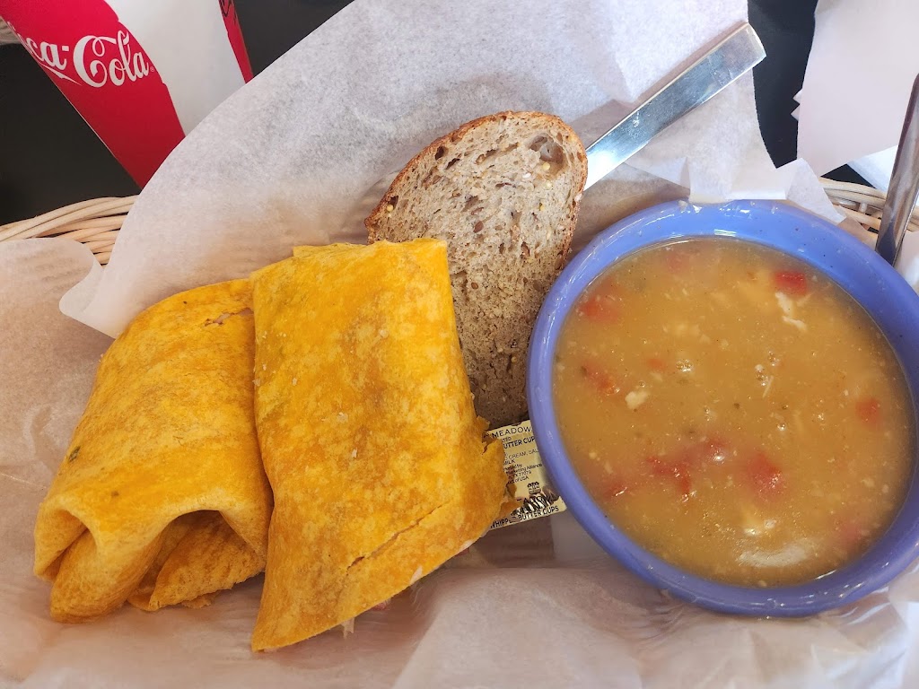 We stopped in because it was close to the hotel. The loaded potato soup perfect, same with cheesey tortilla soup. The sandwich perfect size, and the price less than $10 per person.