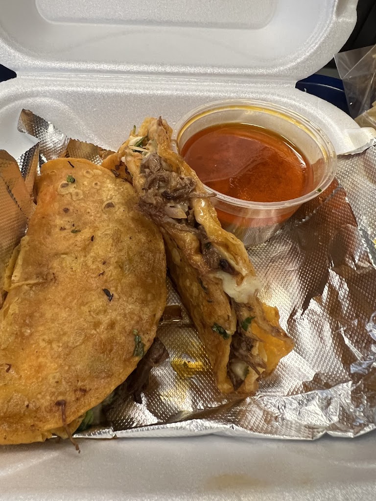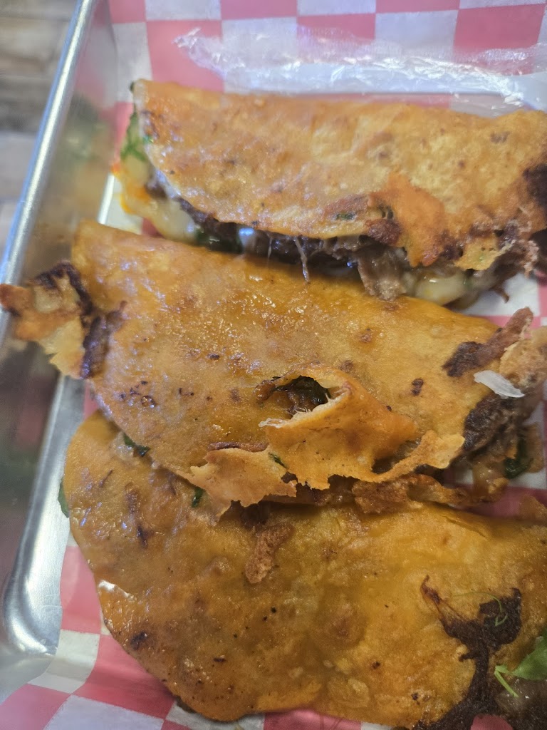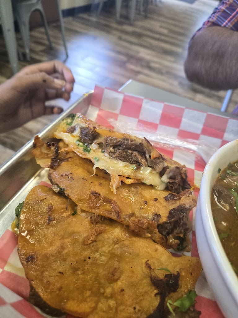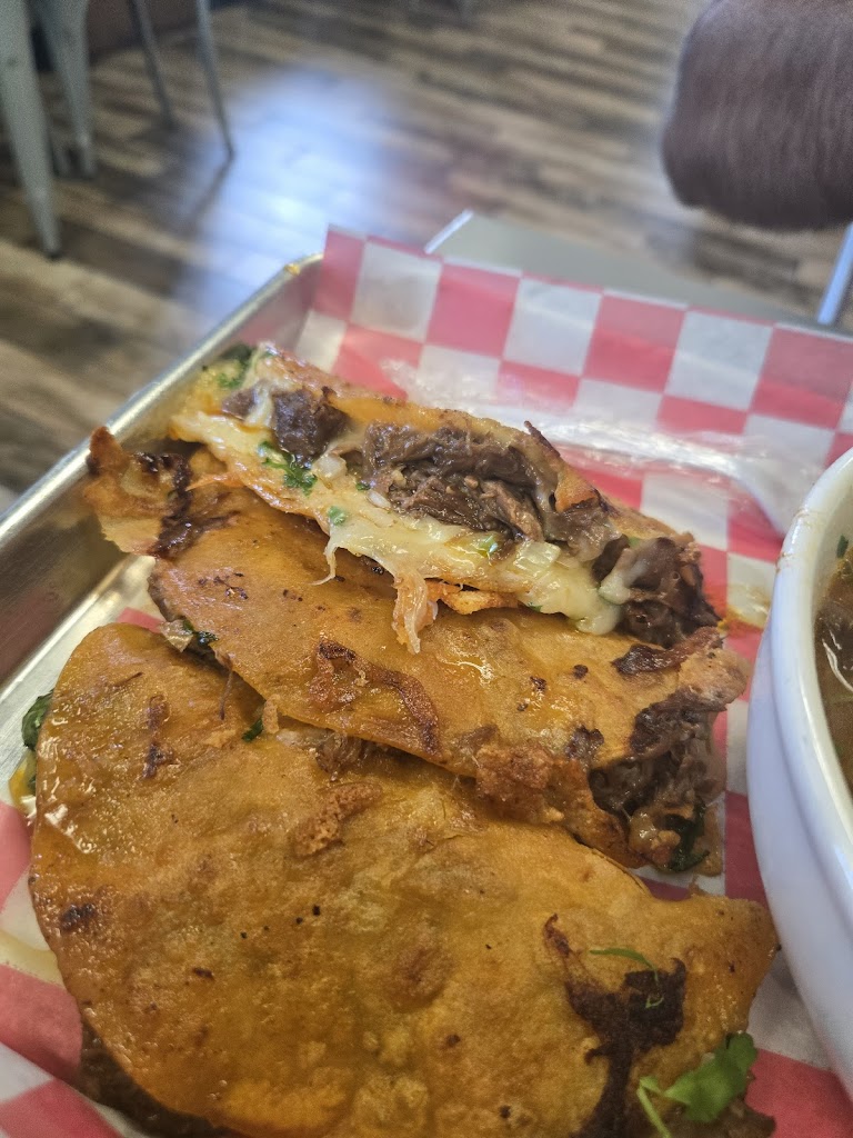 The quesabirria and steak taco was very very good but I was pretty disappointed in the queso and chips, for $6 I got a small reheated side of cheese mix that was not a normal queso blanco consistency like the girl described it as and had a little too much spice for my taste. Regardless for $6 I wouldn’t suggest it. BUT the tacos were amazing! Margarita on the rocks seemed a little bland and no salt like I asked for but would go back for the tacos.