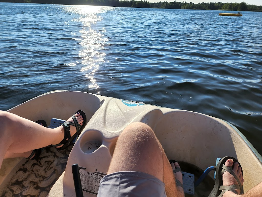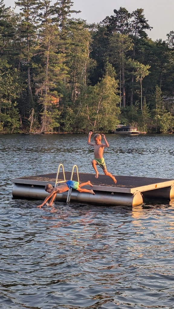 Swimming beaches is generous term, there is no sandy area to enter the water, one of the swimming area merges with the boat launch, the truck parking for the cabin at the bottom of the hill, and the boat landing which is rocky. The 2nd beach area is part of one of the cabins outside seating area and you have to jump off the docks, it felt intrusive to swim there because it felt that area belonged to the family renting that cabin. We ended up going to Moon Lake, between Iron River and Pine Point Lodge which had a sandy swimming beach.