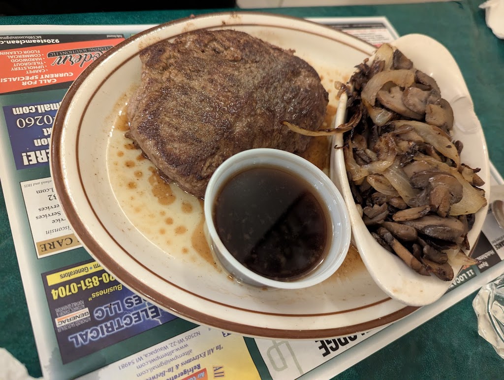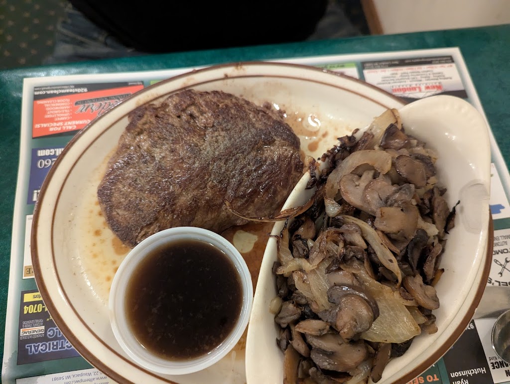 Food was good. There are scant vegetarian or vegan choices. We had poor man's lobster, in another words, broiled cod or haddock. Portions were ample but no vegetable. The atmosphere in the bar was what I expected in a north central supper club but the dining room was a bit too bright and sterile. All in all, it was decent but could use a little more character.