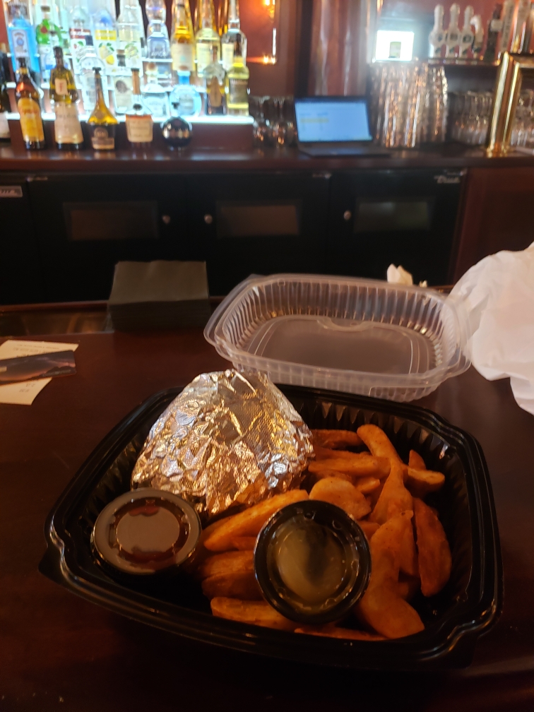 My pulled pork sandwich was ok, it lacked flavor. The seasoned fries were really good. My husband had the burnt ends he said they were ok. He also had a half rack of ribs. He took one look and they cut it thru the bone.. who does that? He took a little bite and was very disappointed he couldn't eat any more.