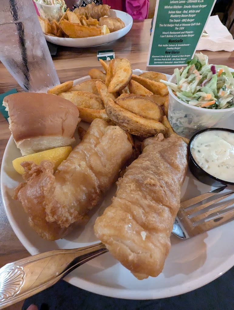 Atmosphere: 2/5 it was noisy. The piano is loud. Great music but loud, can't have a conversation with anyone. Service: 5/5 fabulous service! kind and friendly. Food: 4/5 the beer batter fish has a different taste probably the Guinness beer 3/5 for fish. Fries were good huge chunky fries. Lots of them. They give u a lot a tad bit dry 4/5 for the fries. Cowboy beans were super good! 5/5 cowboy beans.