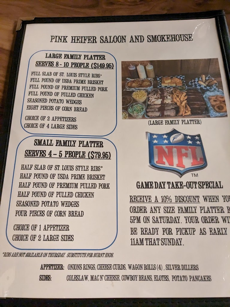 We visited Pink Heifer last Thursday, 5/15/2025. Ordered drinks, and food for eight people. We love the smoked meats and many of us ordered ribs. When owner, Bob, found out he had a special takeout that used up all the ribs he had, he came to our table. He explained what happened, apologized several times, and then proceeded to comp our entire meal with all drinks included. He served samples of everything smoked with sides, to our whole group. He went above and beyond to make us satisfied. I will definitely go back! I encourage anyone who sees this to check out Bob and his staff at Pink Heifer in Monticello, Wi. Needless to say, we left a huge tip, greatly deserved.