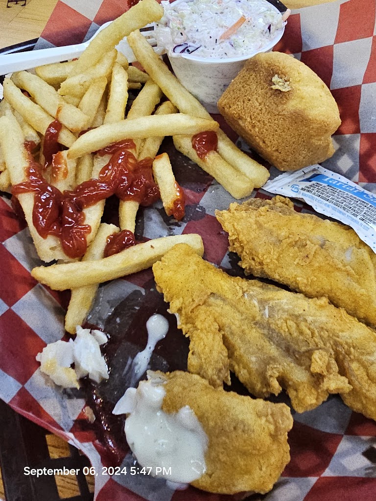 Stopped here after trail riding and was so happy we did! One of us had fish, which was yummy and one of us had a mushroom & swiss burger with a side of 5-cheese mac n cheese. Both were great and plenty of food. Plus, the option to dine-in was so appreciated!
