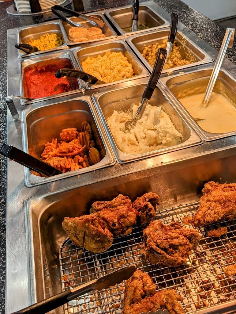 Desert bar was empty/ closed.Many other trays were empty in the pizza section . Corn was cold. Good selection of chicken. Clean dinning area.