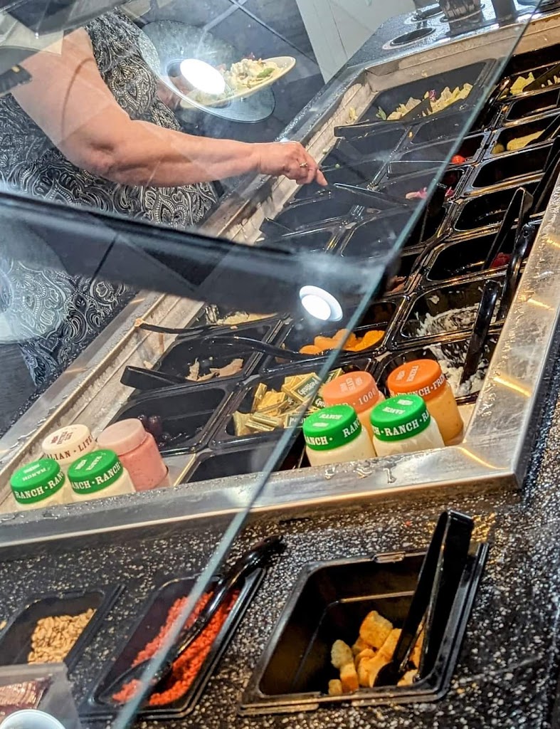 Salad bar,all the fixings, potatoes, stuffing veggie,cactuse bread,desert pizza,