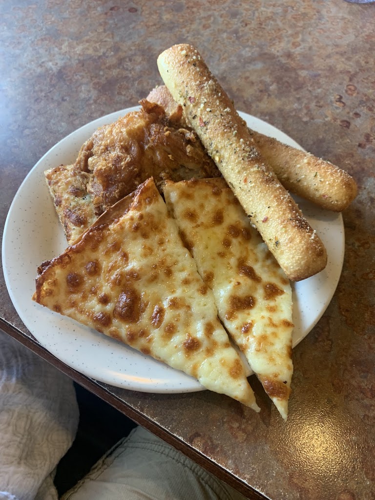 Good pizza buffet that includes fried chicken, vegetables, salad and soup, and deserts. Much better food than expected on a small, fairly inexpensive buffet. The people working (mostly young kids bussing tables and cashier) are always very friendly and professional.