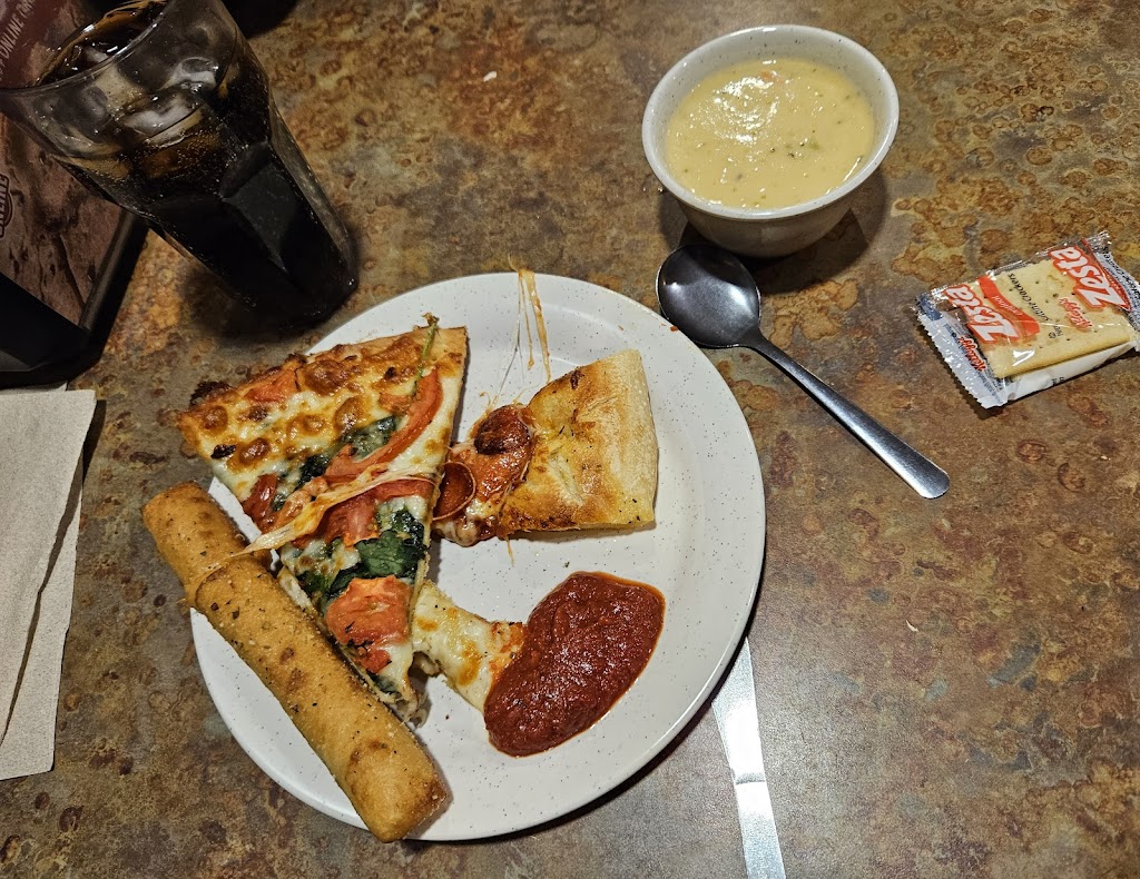 The food and atmosphere was pretty good for an all-you-can-eat buffet. I expected all pizzas but was pleasantly surprised with a lot of other options like fried Chicken, mashed potatoes, stuffing, chicken noodle soup, a salad bar, etc. Nice family place to hang out with friends. I would eat here again if I had the chance.