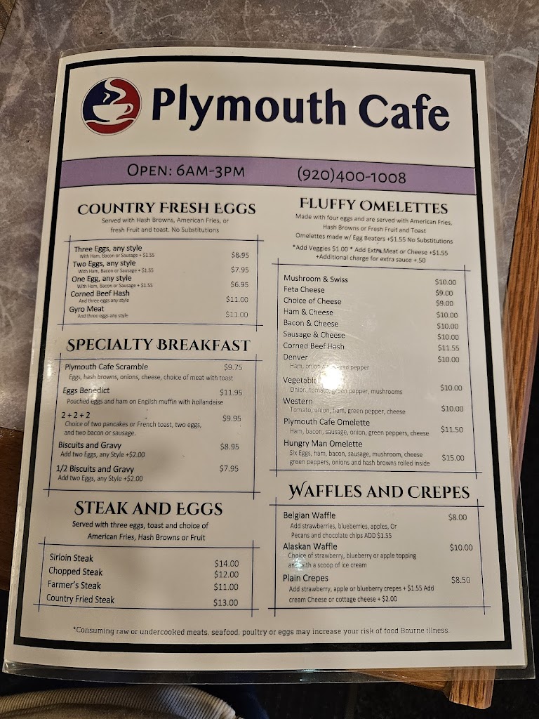 I just discovered the Plymouth Cafe and stopped in for a late breakfast. The food was fast, hot , delicious and the generous portion allowed me to take leftovers home which made two more meals for me. The service is friendly and the servers are personable. I will make it a regular to go to to get a good meal in a very comfortable atmosphere.