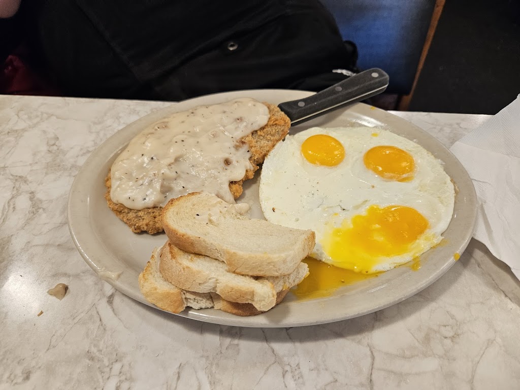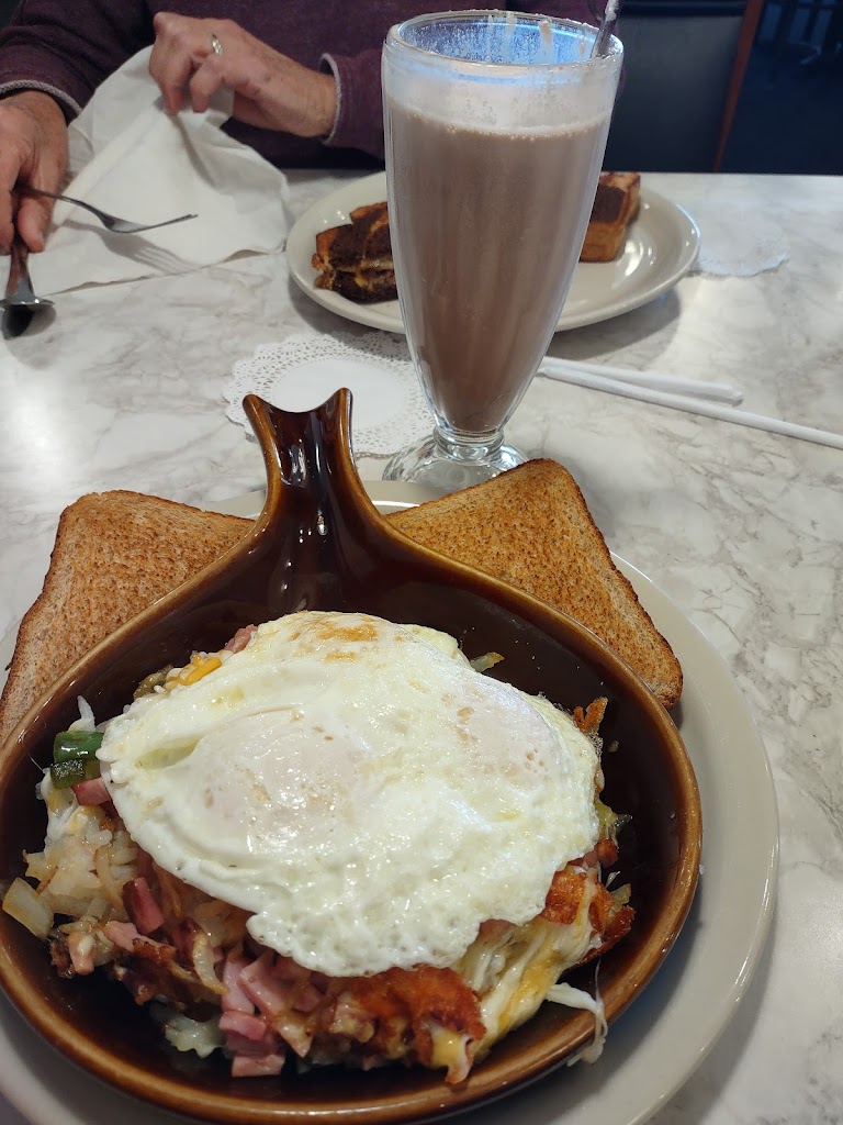 Stacy our waitress is wonderful and my Dad gives her 11 out of 10 and the meal that is pictured is gyro meat with three eggs over hard sourdough toast and American fries it is absolutely wonderful give this place a try.