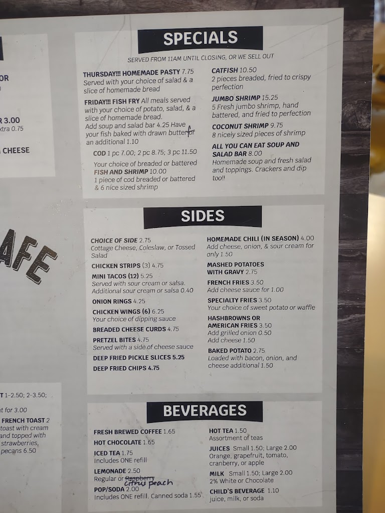 We are a small town cafe that serves breakfast all day long with daily lunch and dinner specials. Our menu is extensive so you should be able to find something for everyone. Please enjoy one of our desserts that are always homemade and fresh.
