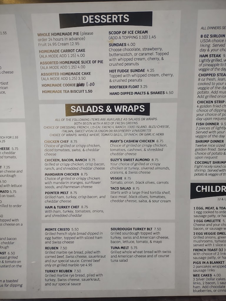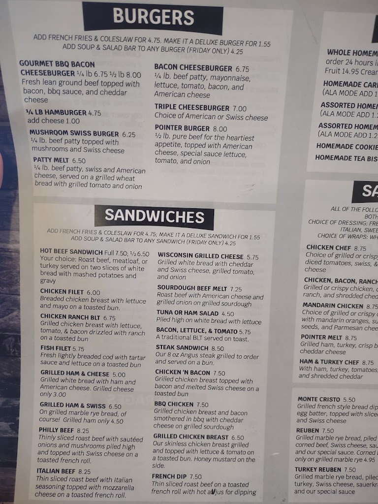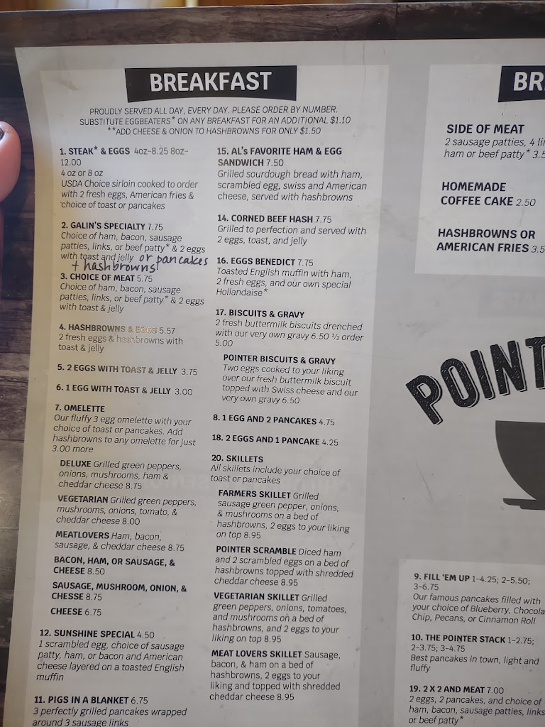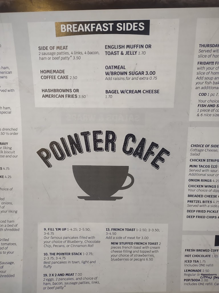 We absolutely love breakfast at the Pointer Cafe! They offer a large menu with something for everyone, ensuring that all tastes are catered to. From hearty omelets to delicious pancakes, the options are plentiful and satisfying.