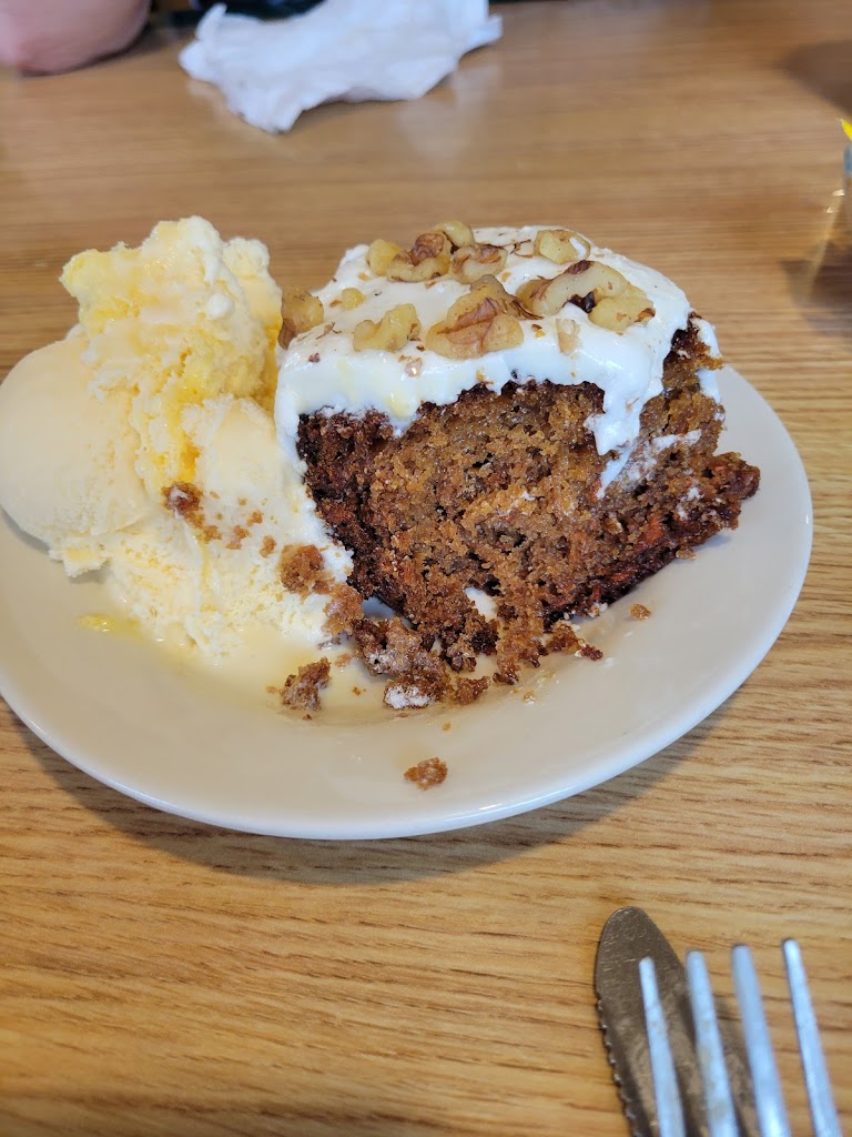 The cake and pie were homemade and delicious! Our food was hot and very good. Service was also pretty good!