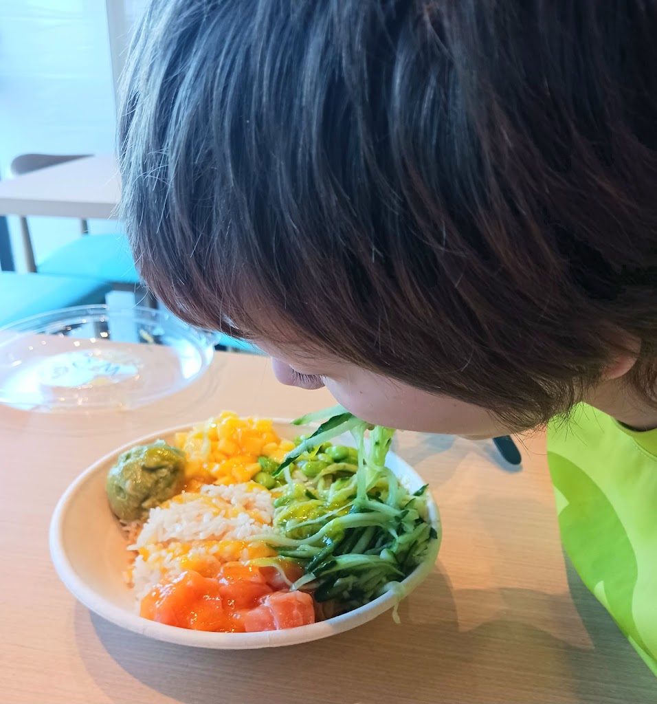 Everything was delicious and fresh, and there are several GF options for people like me!! They even have an ordering screen for times when the line is a bit long for convenience. I built my own bowl, my older kiddo had a Hawaiian mini bowl and my younger ate the Yum Yum Shrimp. Hubby ordered the Ohana Wave. My older kiddo says, "Definitely get the Hawaiian bowl!" My younger says, "This is the best restaurant ever. You should definitely come here!"