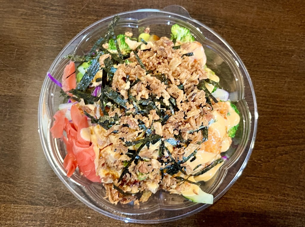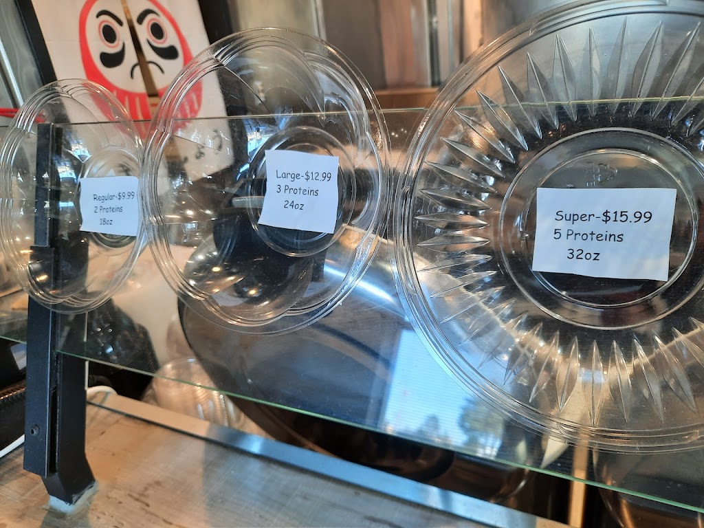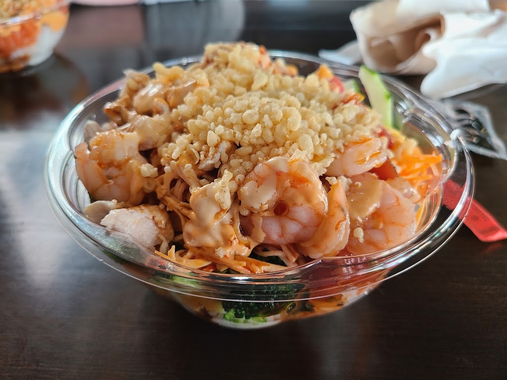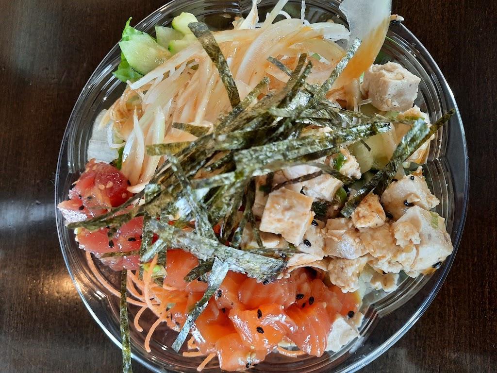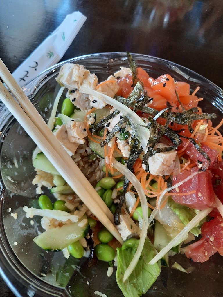 The food is overpriced, but decent. The pricing is a little odd- they charge more for four proteins, but I can’t imagine someone actually wanting four soft types of fish/chicken in one bowl.
