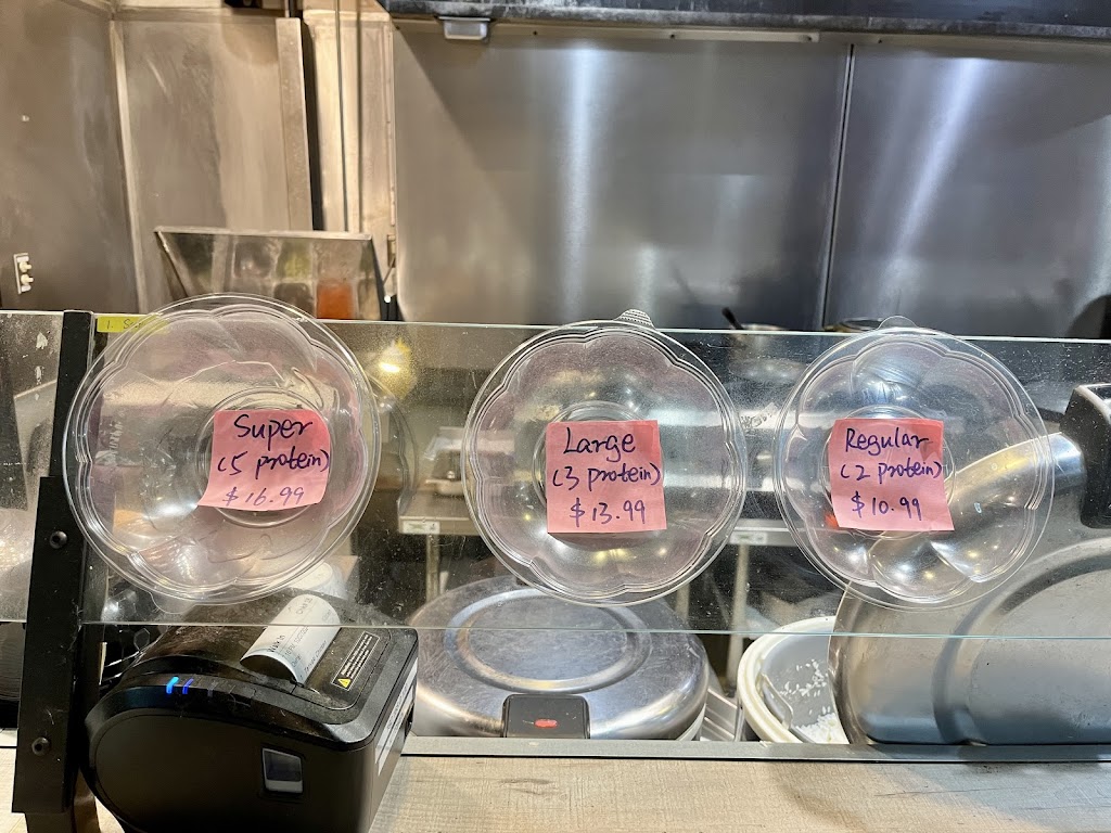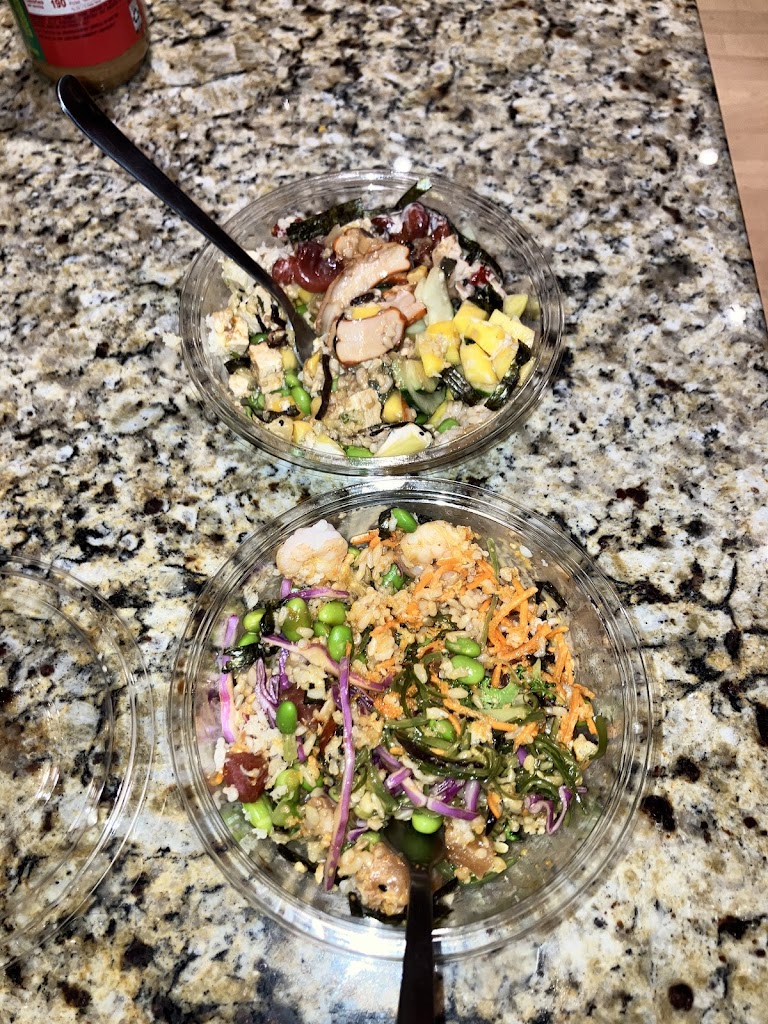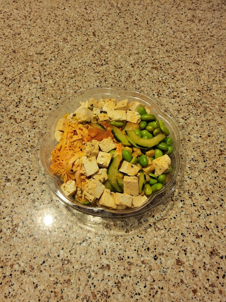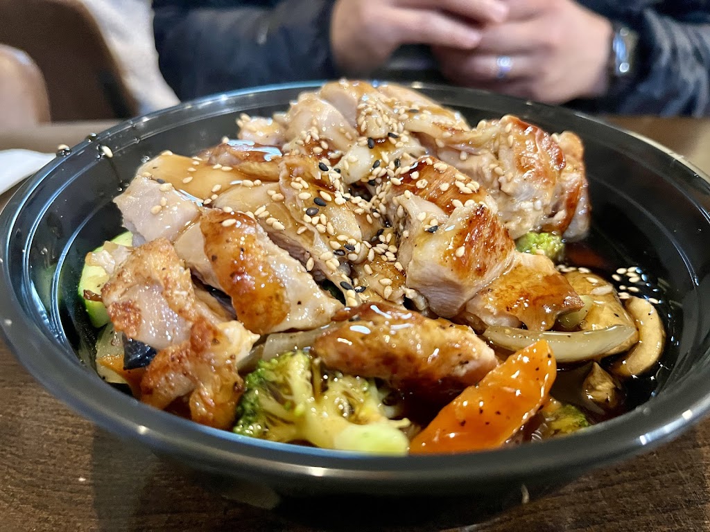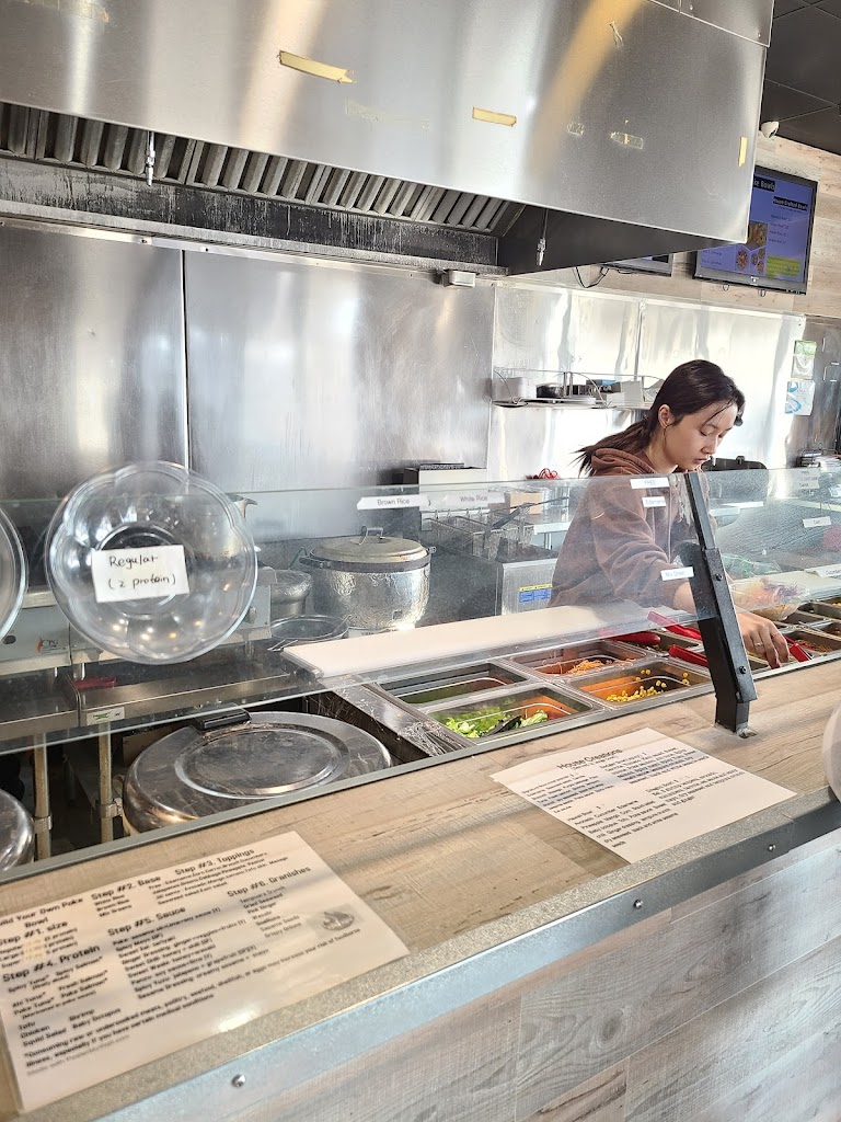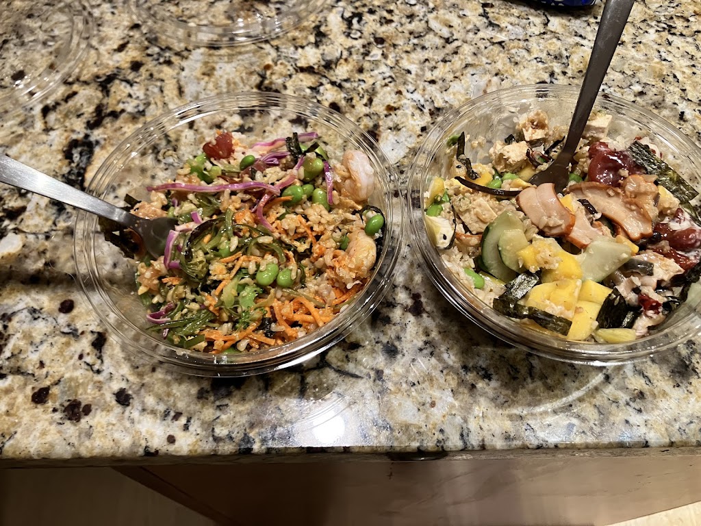 The food is overpriced, but decent. The pricing is a little odd- they charge more for four proteins, but I can’t imagine someone actually wanting four soft types of fish/chicken in one bowl.