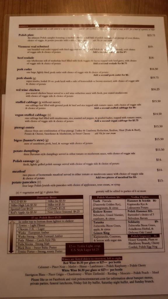 I was so glad to eat at Polonez and enjoy that last real dedicated Polish meal that Milwaukee offers. The stuffed cabbage, pork cutlet, and veal schnitzel were all excellent. The pierogies were a nice treat as was the super delicious czarnina. Polish sausage was moist and plump however I would have preferred more flavor. Potato pancakes were great especially with apple sauce. Photos don't do the food justice.