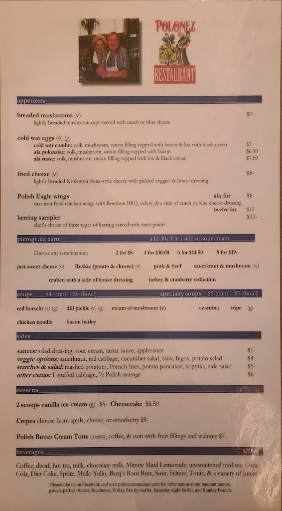 Polish food "at its finest" or albeit coarse. Not a full blooded connoisseur of its bon appetit, but enjoy kielbasa, and the newness of trying pierogies. Also, the option of having Charnina, a Polish soup, and having the likes of a a delicacy similar to the Chinese egg roll, consisting an egg dipped, paper thin dough wrapped, fried roll of vegetables.