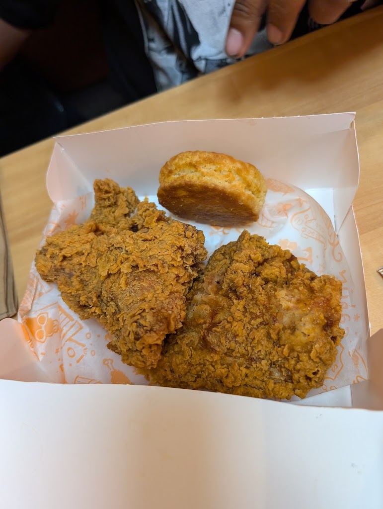 Very fast service, chicken was hot perfectly crispy and the biscuit was delicious.