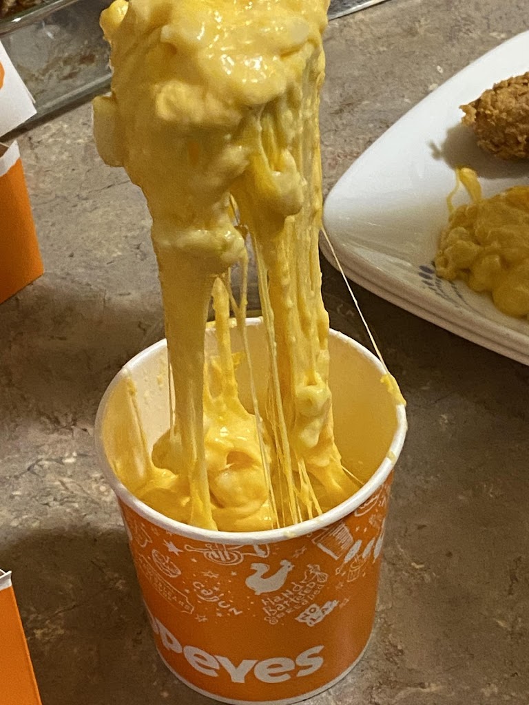 the chicken tenders were old and crusty, not warm/hot and juicy. fries were old too. i got no receipt. one of my drinks had soda dripping all over the sides they didn't bother to wipe it down. mac n cheese? I'm not sure if it's supposed to look clumpy but it still taste good. my order taker did an amazing job. I ordered a chicken tender meal and he clarified if it was classic or spicy when i asked what were my options for sides he told me too. i didn't ask for his name i probably should have but he was very good at taking my order in the first lane. give him a raise. he was working today around 2:30pm and wasn't wearing the popeye's uniform but a collar shirt?