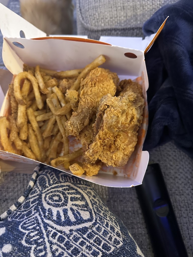 My boyfriend and I decided to get some food here and this was his first time eating here. We got there right there at 11, a whole hour for it to close. The first problem we came too, which should have been our big red flag, was the menu being turned off. So, my boyfriend and I had to try to search for it online. While this was happening, someone who could not speak English was trying to figure out what was going on but could not understand what we were trying to say so she brought someone else over but they spoke very little English. We decided to just order what we figure every chicken place would have, chicken tenders, me, and my boyfriend, chicken sandwich. But when we try to order sides, the new guy didn’t see to know the sides themself? (Later I found out he left some out; which normally wouldn’t be an issue but the menu was off). We tried to ask for fries but he said, “No, that’s tomorrow,” which, we figured he meant they weren’t cooking them up anymore which is weird because they still had a full hour to cook. But then as we tried to get a different side, one of mac cheese, he told us there is ONLY one size of a side??? And it was a large, which we didn’t want but that was one of the only things they had. So they up charge us for that. We felt weird backing out now and decided okay fine, we will just pay and leave. Even though nothing went right at all.