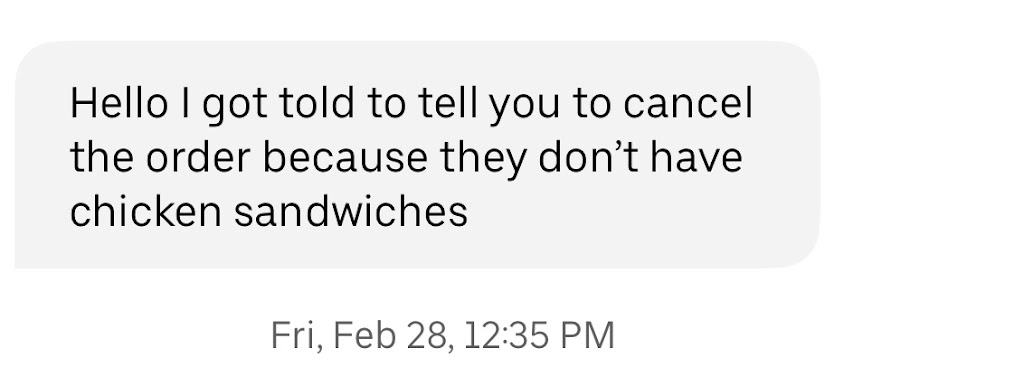 Edit: On 2/1/25 i ordered two chicken sandwhichs and got two tenders on some bread instead of a chicken breast. If the tenders actually had meat I wouldn't be upset, but with skinny tenders it's terrible.