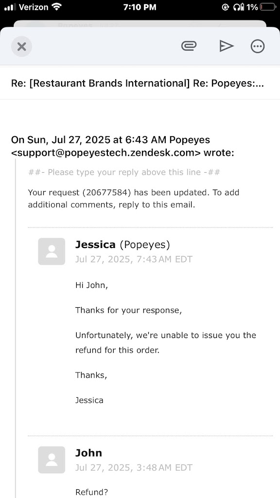 Rico the manager was disrespectful rude and like I said before we need to boycott all Popeyes because apparently if customers have issues there’s no place for us to call. There’s no place for us to get any resolution but they keep having rude employees no chicken no hot sauce no honey no large cup but you get mad at me.