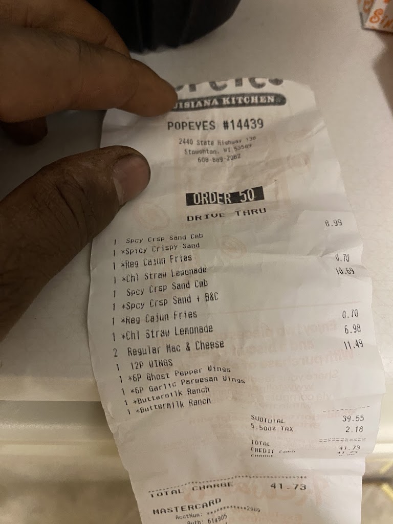 Food was hot and fresh we ordered the 8 pc family meal. Friendly staffed and well trained keep it up. I love we have a location in Stoughton, WI now. 5 stars all day and thank you