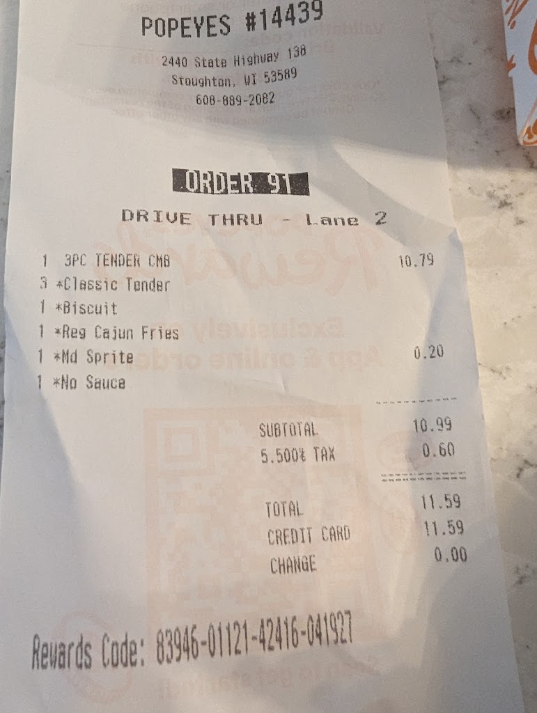 Got a 3 piece chicken tenders. Chicken was dry and very thin pieces. Tasted like they had been sitting under a heat lamp for awhile. Biscuits were dry and had no flavor. About the only thing good about this experience was my root beer. Cause of course my cheesecake was frozen. Would not recommend this location. I guess this is the next Taco Bell/kfc of Stoughton.