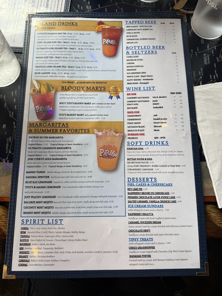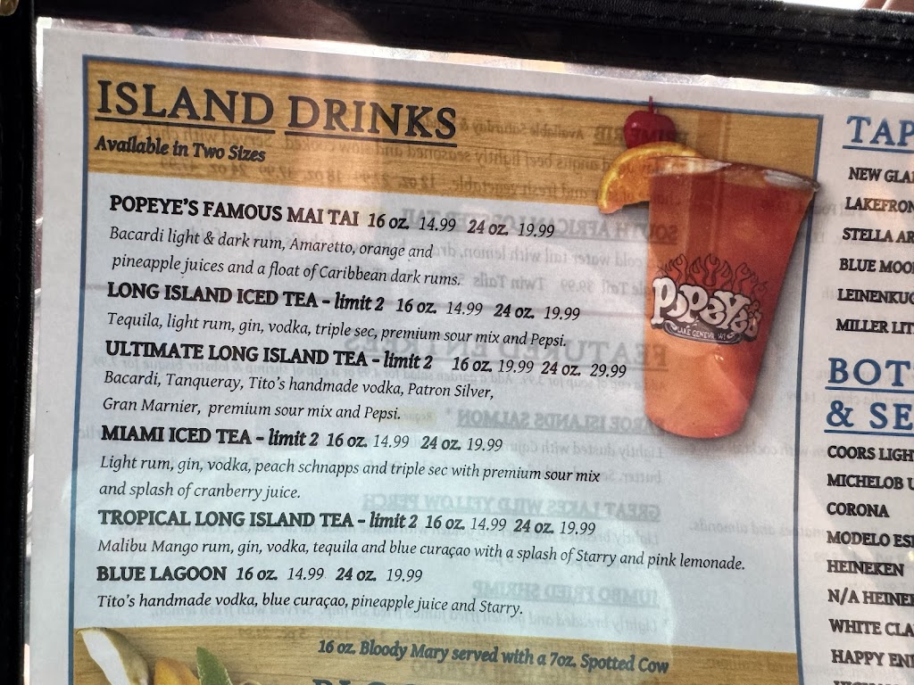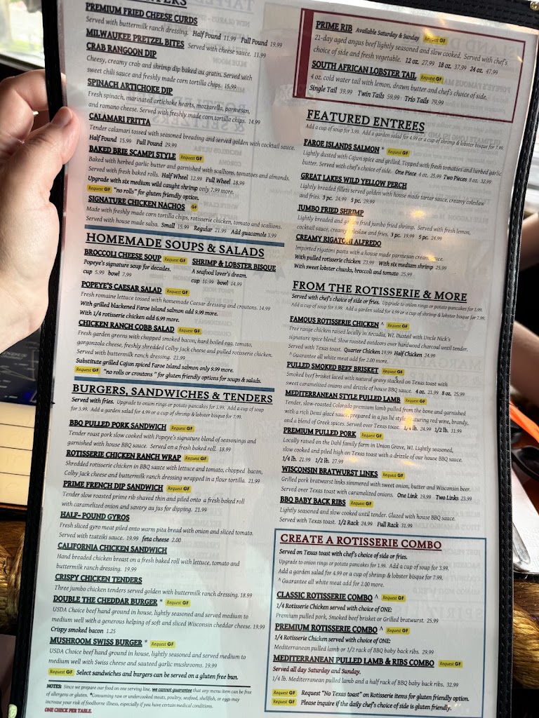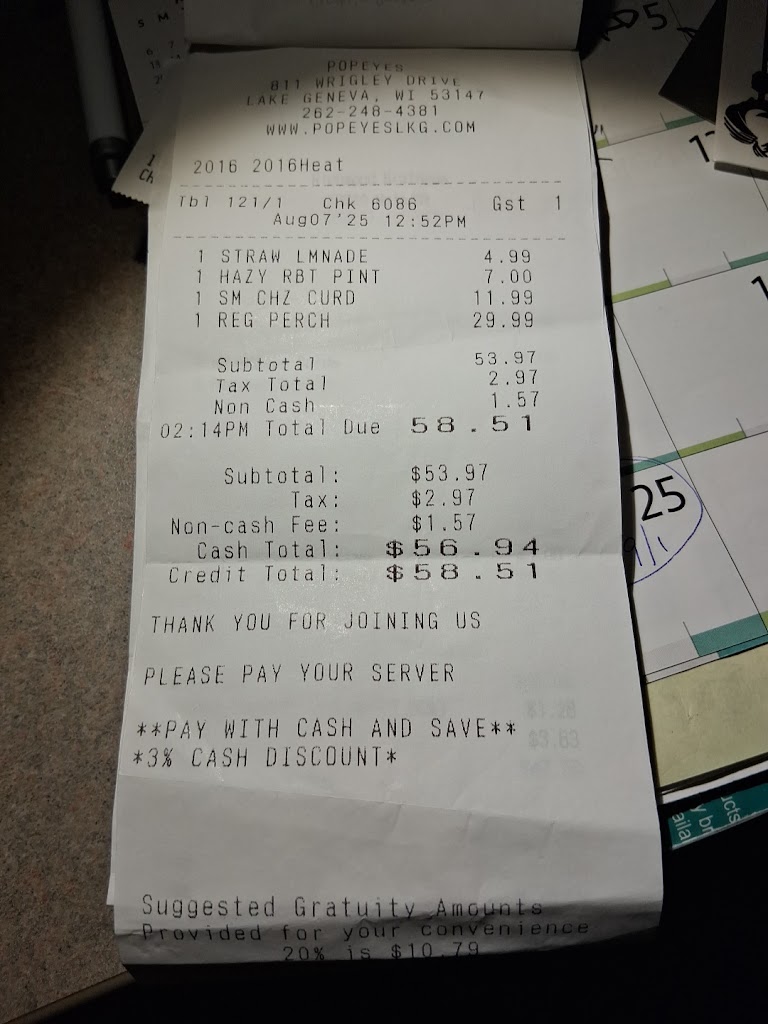 We enjoyed a lunch at Popeye's. We were looking for a place right on the lake for lunch. Outside seating was all taken, but we were seated right by a window overlooking the lake. Our table choose different items and everyone enjoyed them. I had the bratwurst on a pretzel bun. The bratwurst was great. It was served with honey mustard, which was good, but wish it was served with a spicier mustard. We are looking forward to coming back to Popeyes on our next visit to Lake Geneva.
