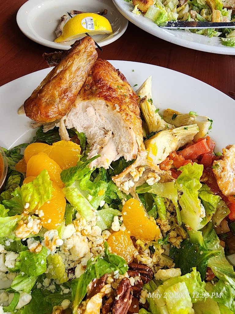 I got the Cobb salad - I swapped the dressing but when I. The tomatoes were mushing and bland. The 'fresh rotisserie chicken' wash overly brined deli chicken meat. I swapped the ranch for a balsamic. I asked the waitress if it was a creamy or the vinegar/oil kind, she said the latter but it was the former. I also asked to upgrade to the salmon per, as the menu said it was an option. She said it wasnt allowed. when I pointed out the menu, she still said she could ask a manager but I decided not to press it...I should have the chicken sucked. It might as well have been picked.