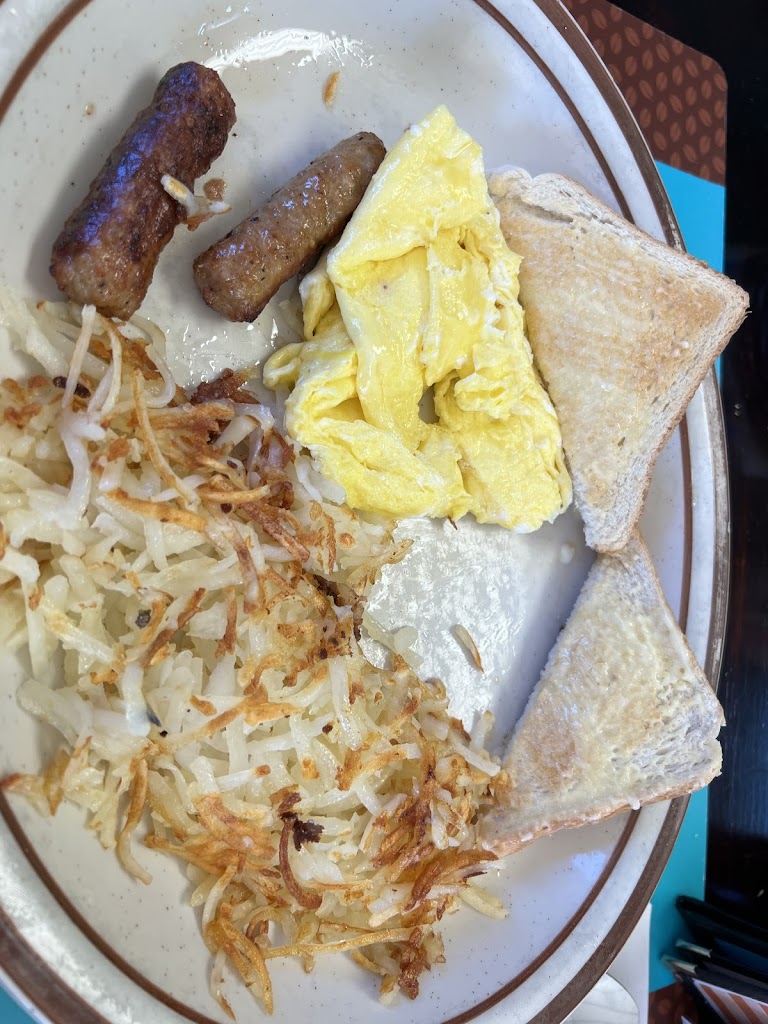 Service is slow i got 2 very good eggs half a cup of coffee no offer of a refill skimpy order of hash browns 2 burnt sausages and toast was late. Price was cheap but so was the food and service